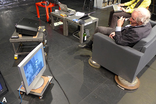 A- André S. Labarthe regardant l'interview de JL Godard par Iks ©Association Arsène