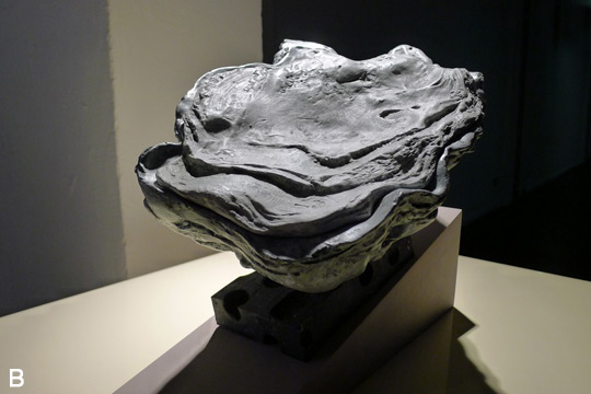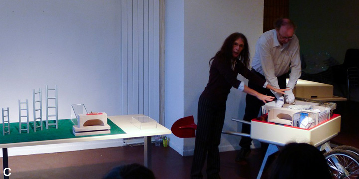 A - Marcel en Nain de jardin présente la valise T ©Yann Le SouchuB - Sandwich tangent Louise Poirier/Duchamp Duchamp/Louise Poirier ©Yann Le Souchu