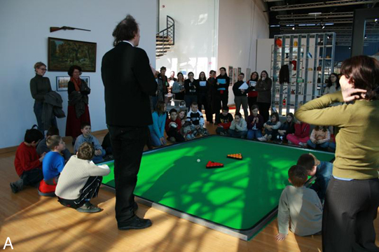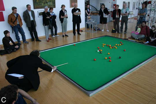 Cette installation relationnelle se joue au sol sur une surface lisse sans trou avec 32 boules. Les boules ne sont pas numérotées, mais sur chacune d’elles est inscrit un concept de l’Art Tangent. Chaque joueur a au choix, une queue ou un club de golf. Il faut 2 joueurs au minimum et un juge de touche (il vérifie les contacts et enregistre les combinaisons de mots) ; le billardT est un sport public.