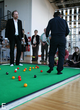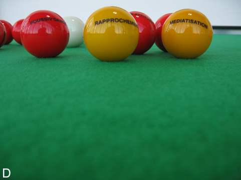 Les joueurs annoncent le coup avant de le tirer, c’est-à-dire les deux boules qu’ils souhaitent réussir à faire se toucher. La partie de billard est une occasion d’affiner les concepts Tangents en produisant du discours qui s’appuie à chaque fois sur une œuvreT astucieusement choisie. Le propos doit à chaque fois s’appuyer sur une œuvreT astucieusement choisie et doit durer au moins 3 minutes, soit le temps d’aller se faire cuire un œuf.