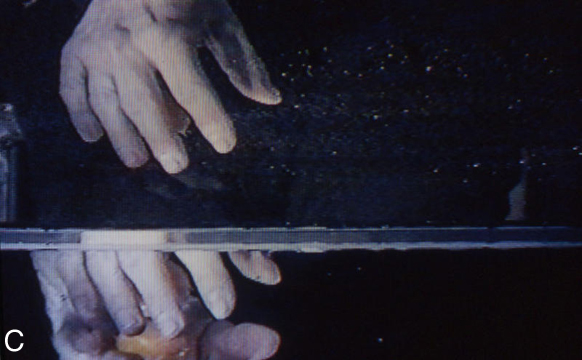Deux personnes se font face. L’une est assise devant une sorte d’aquarium incliné : sous ses mains apparaissent deux jaunes d'œufs frais qu'elle manipule dans l'eau en les faisant apparaître ou disparaître dans une chorégraphie lente. Elle dit à voix basse le texte de G. Didi-Huberman. L’autre personne se tient debout derrière une caméra et filme la performance. Entre la caméra et la table d’eau, un moniteur situé face au public lui permet de voir une image des gestes en plan rapproché, et lui permet d’entendre le son de la voix, amplifié.