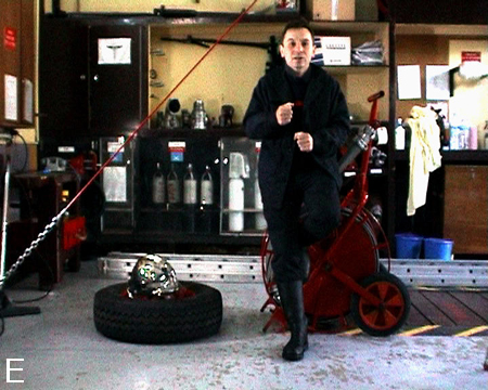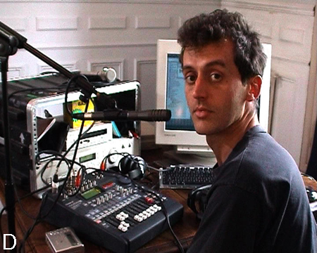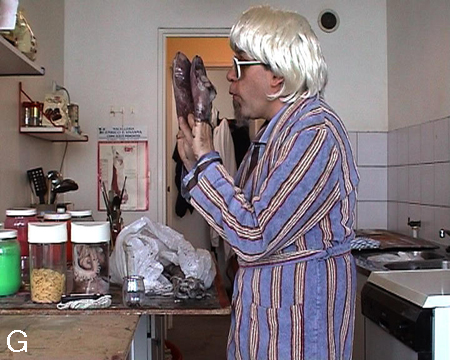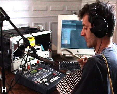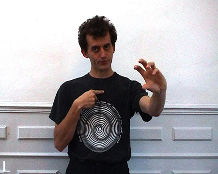 L- Fernand dirige un orchestre de musique concrète en direct, à distance, par Internet (à sa main gauche, le signe pour : « ouvrir très vite le robinet »)