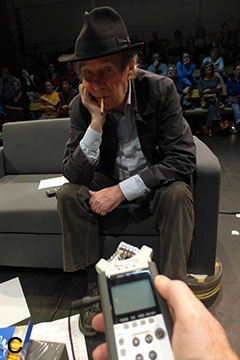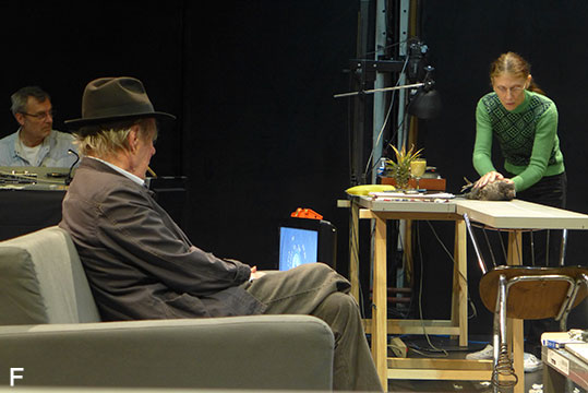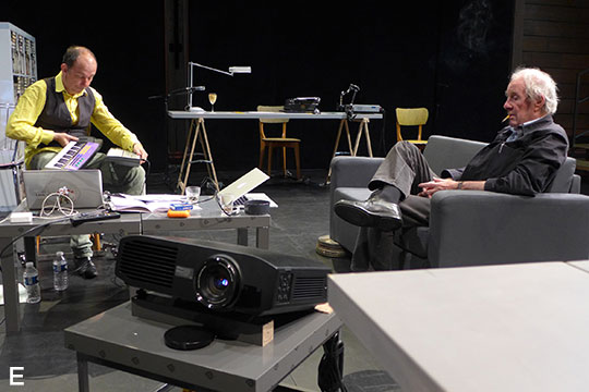 « Je n'y suis pour personne » : ça serait l'idéal, faire une pièce de théâtre, et à la fin, savoir que la pièce sera réussie si je peux dire je n'y suis pour personne. Le travail de théâtre consisterait à s'expulser de la pièce ; alors que les gens essaient de s'y retrouver, de s'y mettre, et on en a jusque-là des ego comme ça qui sont sur scène. Arriver à vider le théâtre de soi-même, là on aurait quelque chose de neuf, sur scène, mais c'est beaucoup de travail quoi, c'est ce qu'on essaie de faire là... arriver à (...)