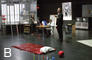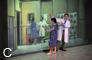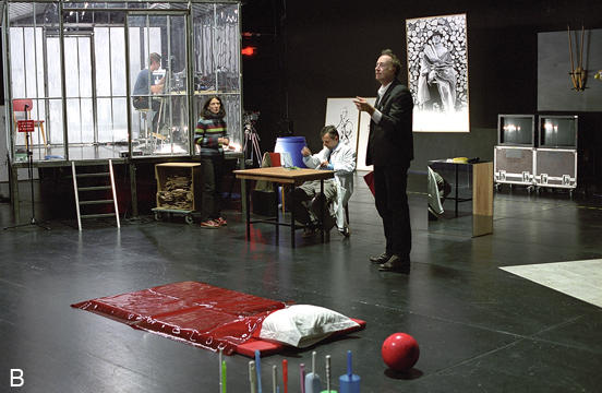 C- La serre de culture. Régie et studio photo. Au premier plan, des spectateurs regardent leurs portraits (série des « Portraits d’inconnus connus »)