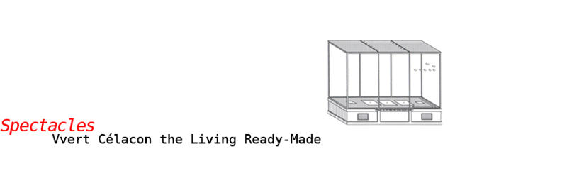La représentation de ce "Living Ready-Made" est un événement phénoménal pour le spectateur. À l'aide d'apparitions et de manipulations, Vvert Célacon provoque l'émotion esthétique magistrale et des télescopages artistiques qui, bientôt, s'avèreront la quintessence de l'art de notre temps. Devant Vvert Célacon, chaque regardeur est mis en position de parier sur le devenir de l'art contemporain et de le fabriquer."